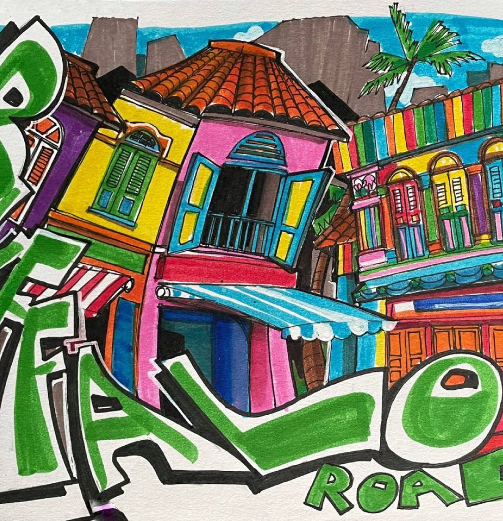 The graffiti-inspired painting style conveys the spontaneity of the people and environment in and around the area. Even though Little India’s shophouses are smaller than the surrounding massive buildings, it is their vibrant colours which draw people to the district as colour always wins.